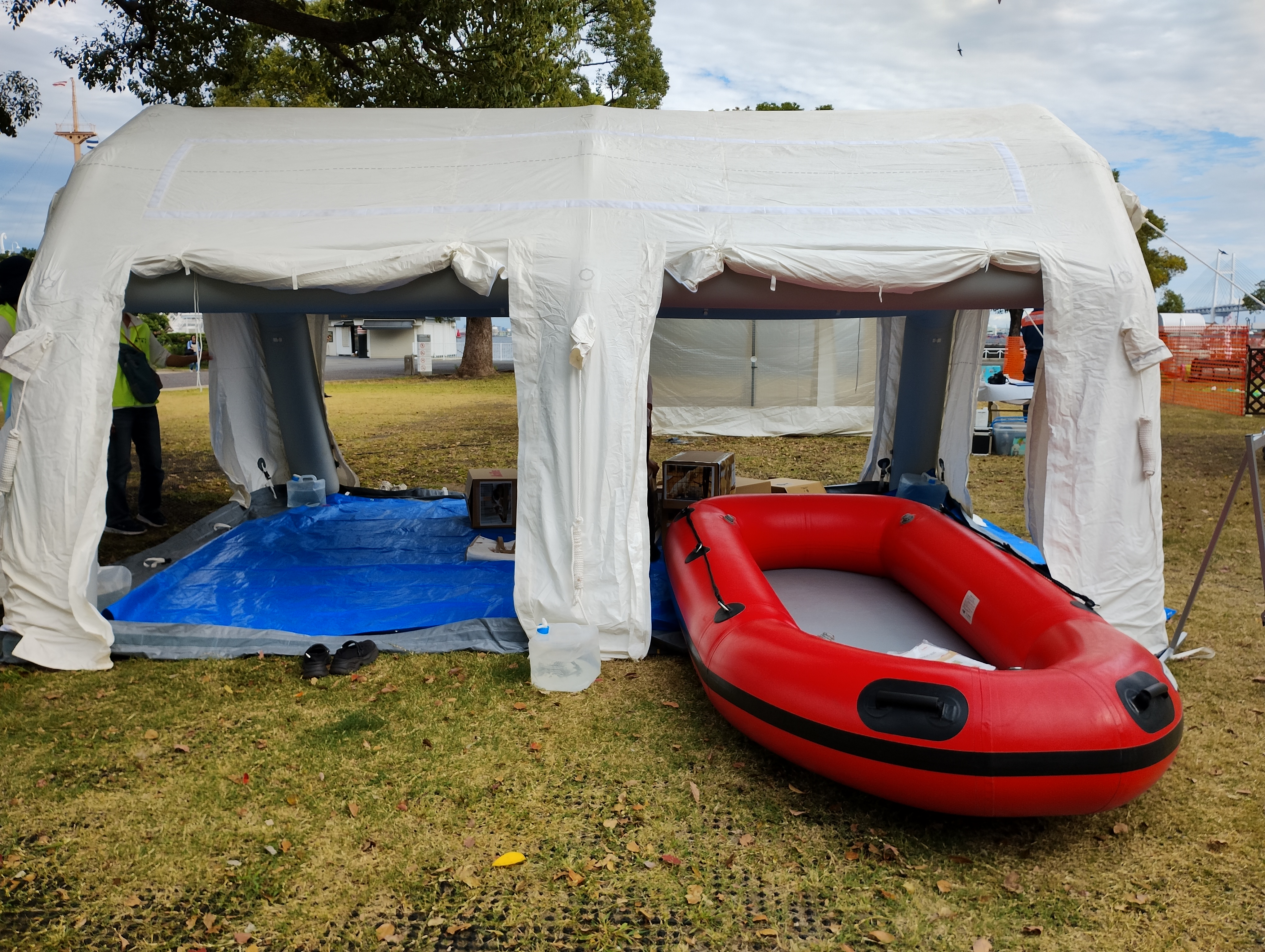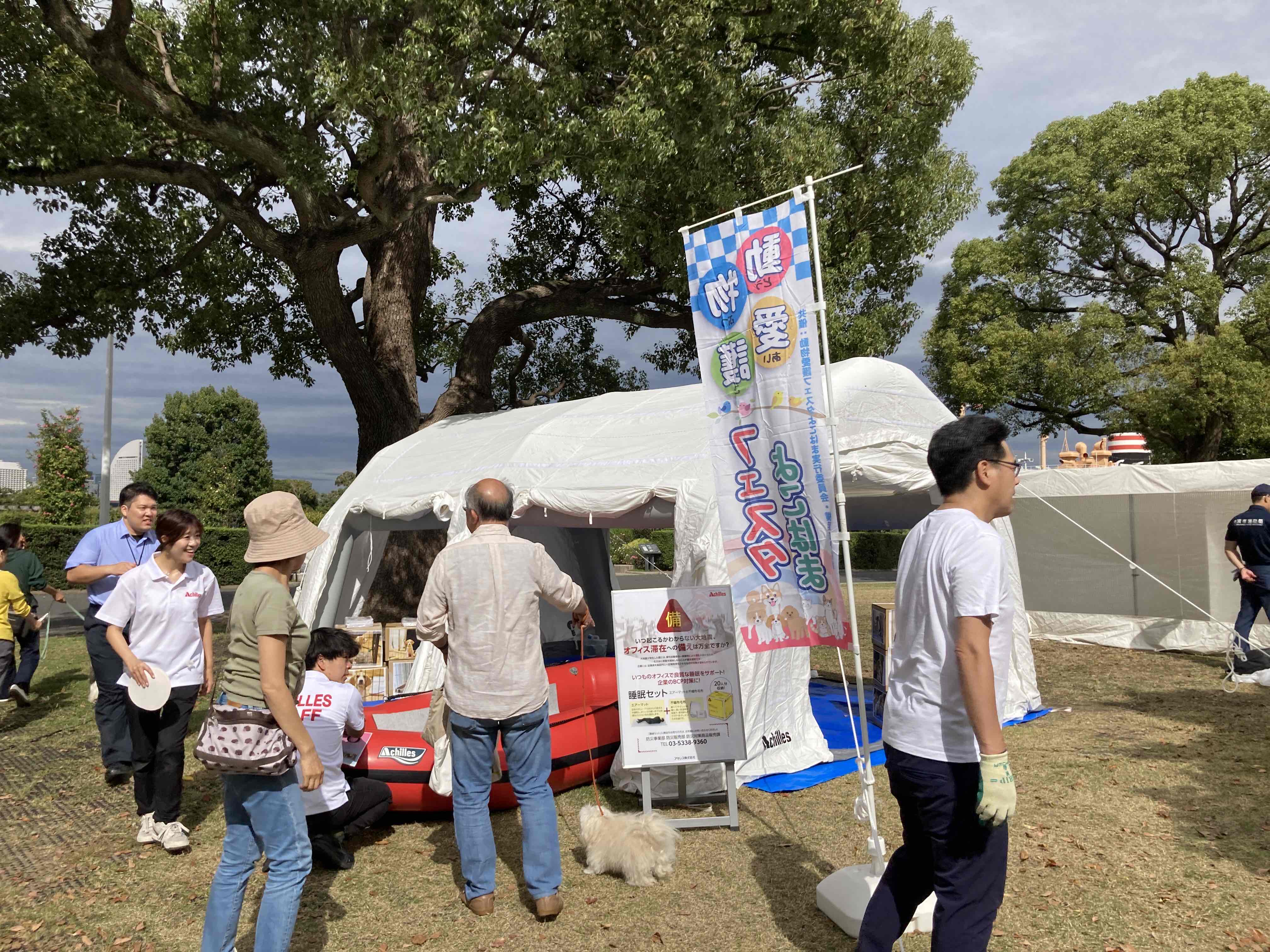 エアーテント展示では、実際にテントを立ち上げることでペット用避難施設に見立て、災害時のペットの居場所を再現しました。