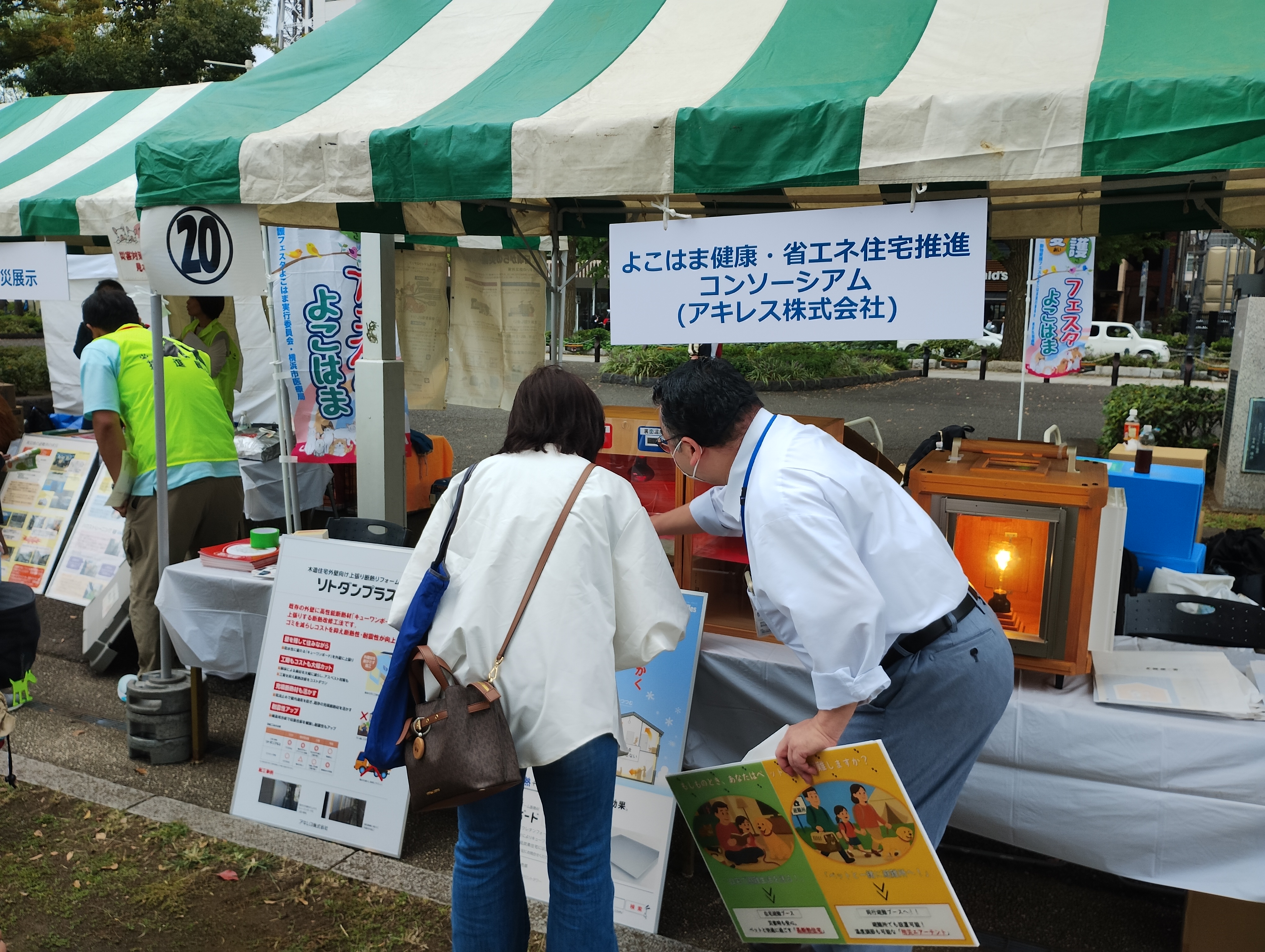 当日はよこはま健康・省エネ住宅推進コンソーシアムメンバーのアキレス株式会社により、断熱材の断熱効果体感デモ機を展示し、高断熱住宅の性能を体感できるブースや、ペットとの避難所への同行避難の際等に活用される防災エアーテントを展示し、ペット用避難施設に見立てたブースを出展し、ペット飼育における高断熱住宅のメリットや災害時の備えについて普及啓発を実施しました。