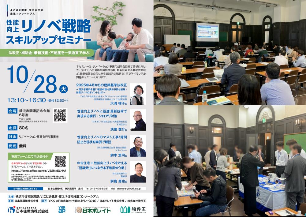 令和7年10月28日(火)に、よこはま健康・省エネ住宅推進コンソーシアム主催により、「性能向上リノベ戦略スキルアップセミナー」を横浜市開港記念会館にて実施しました。